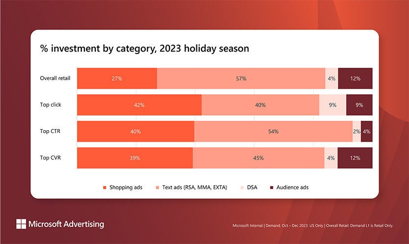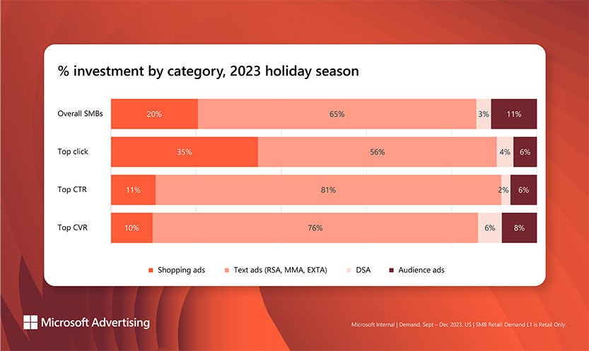 Microsoft Advertising analyzed the Top 20 SMBs by performance type in the 2023 holiday season.3 The twenty clients who prioritized high volume through high clicks also had the most diversified investment strategy between Shopping Ads, Text Ads, Dynamic Search Ads (DSA) and Audience Ads. These clients capitalized on brand awareness by knowing how highly valued SMBs are, and prioritized greater budget towards Shopping Ads to help them compete with the largest retailers. Seen below, the top 20 SMBs across the Microsoft retail sector had the best level of diversification, and the highest investment in Shopping Ads.