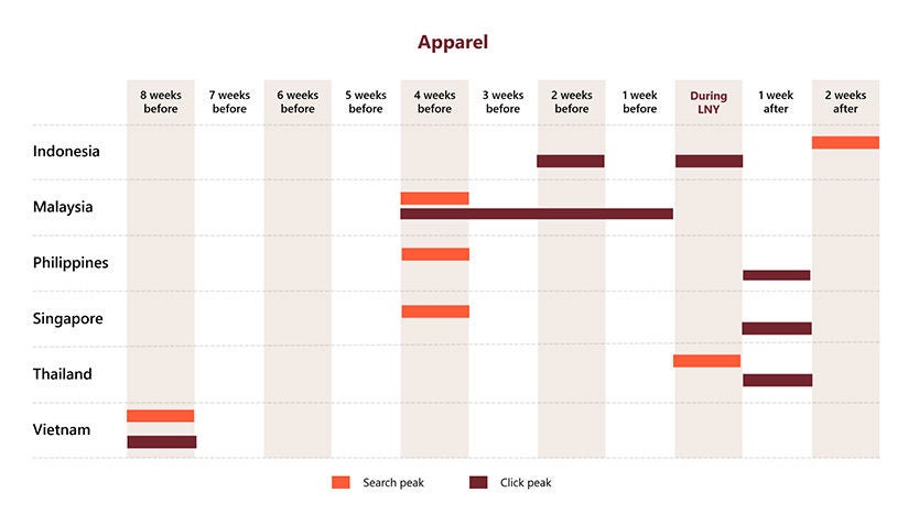 Apparel search and click trends across Southeast Asian countries around Lunar New Year.