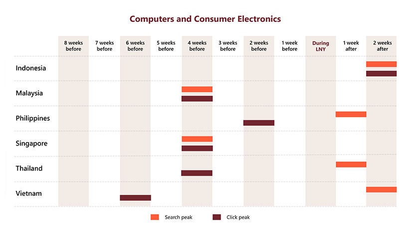 Search and click peaks for Computers and Consumer Electronics in Southeast Asian countries around Lunar New Year.