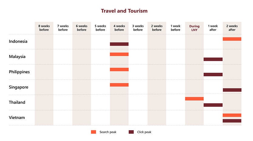 Travel and Tourism search and click peaks around Lunar New Year in various Southeast Asian countries.