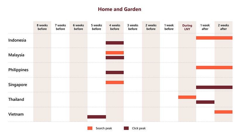 Home and Garden search and click peaks around Lunar New Year in various Southeast Asian countries.