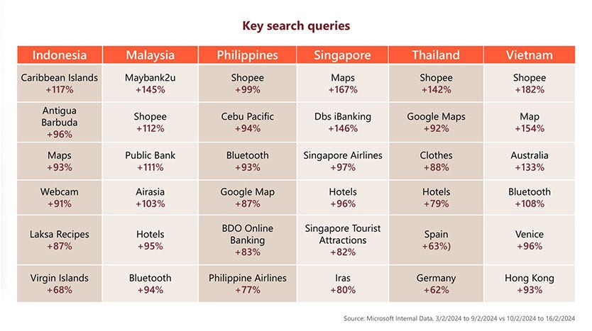 A table of key search queries across six Southeast Asian countries: Indonesia, Malaysia, Philippines, Singapore, Thailand, and Vietnam. Each country has a list of top search terms along with the percentage increase in searches for each term.