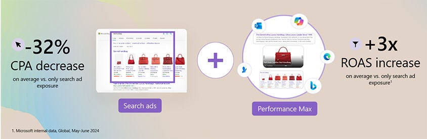 If we unpack the data even more, we can see more ways of how PMax is helping advertisers reach more customers with the right message at the right time with our industry-leading AI. First off, PMax is optimizing ad formats and improving click-through rates (CTRs) in search and Copilot. For example, in data from April to June 2024 with Performance Max campaigns compared to search campaigns, Performance Max increased CTR for multimedia ads and product ads in Copilot by 5% and 25%, respectively, and a 6x increased CTR for dynamic search ads in Bing search.