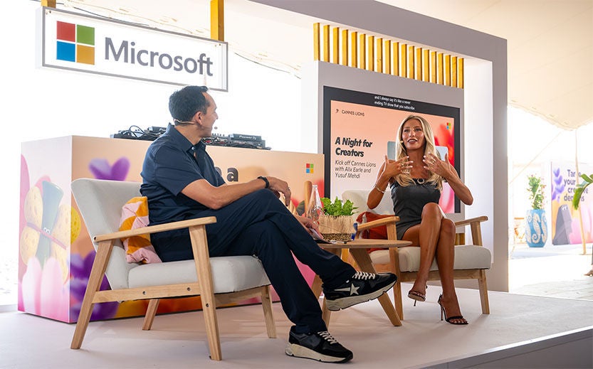 Yusuf Mehdi and Alix Earle in discussion on a colorful stage at the Microsoft Creators Lounge at Cannes Lions 2025.