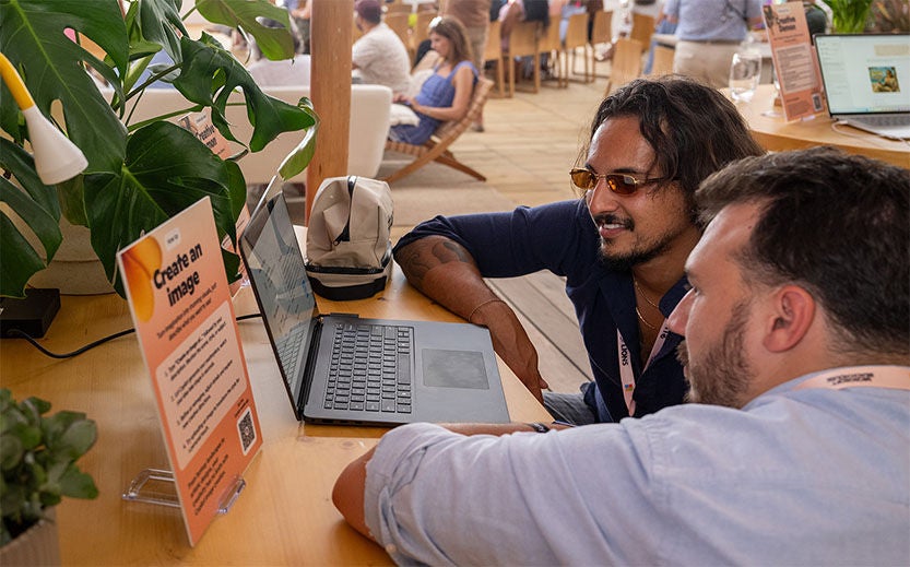 Two people collaborating on a Copilot image creation demo at a wooden table at the Microsoft Beach House at Cannes Lions 2025.
