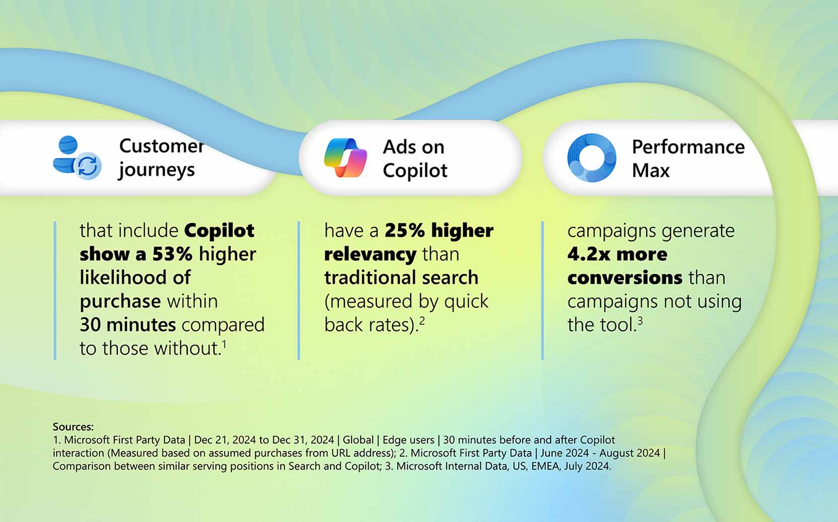 Infographic highlighting the impact of Copilot: 53% higher purchase likelihood within 30 minutes, 25% more relevant ads, and 4.2x more conversions with Performance Max campaigns—based on Microsoft internal and first-party data.