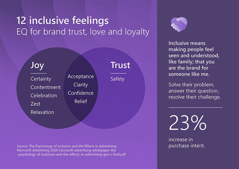 Trust may be the foundation, but it’s not everything. In fact, our research has identified 12 inclusive emotions in advertising that contribute to purchase intent.1