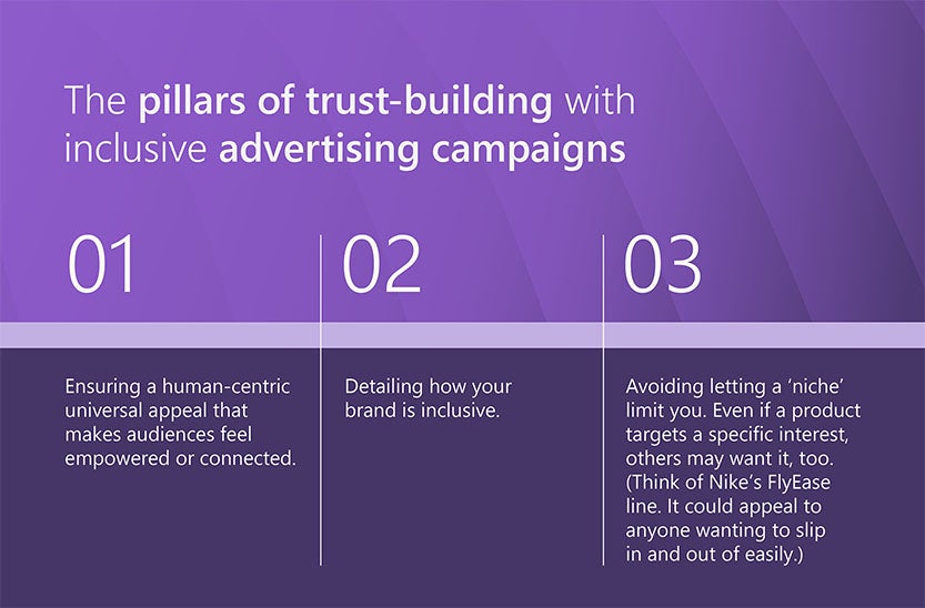 Three pillars of trust-building in inclusive advertising: universal human-centric appeal, clear brand inclusivity, and broadening beyond niche audiences.