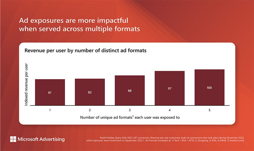 As customer journeys continue to evolve, we set out to understand what impact that omnichannel marketing has on the bottom line. What we found is that last Holiday season, customers who were exposed to more unique ad formats spent more than customers exposed to fewer ad formats. In fact, when customers who were exposed to Audience Ads, Multimedia Ads, Dynamic Search Ads, Product Ads, and Search Ads spent 23% more than those exposed to Search Ads alone.1