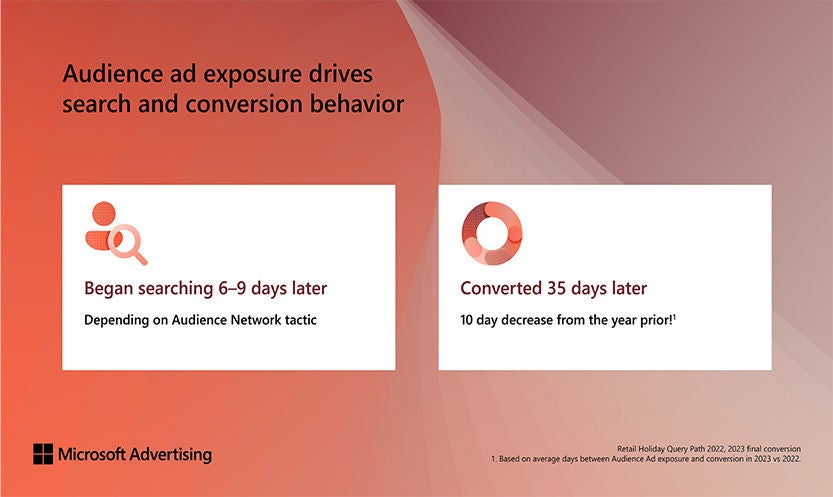 The holiday shopping conversion window is long, taking 47 days on average.2 One approach we’ve observed that’s influenced customers to convert sooner is diversifying advertising across formats and channels. Specifically, pairing display, native, and video ads with search ads shortened this conversion window by 10 days YoY. This is because Audience Ads maximize your reach and generate new demand with rich storytelling canvases across our network, that then turn into search intent and conversion behaviors.